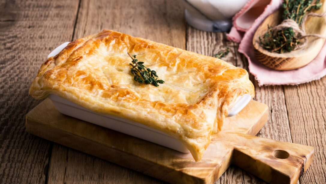 If you don’t have any ham, just use turkey. Some roughly chopped chestnuts, if available, can be sprinkled over the filling before topping with the pastry.