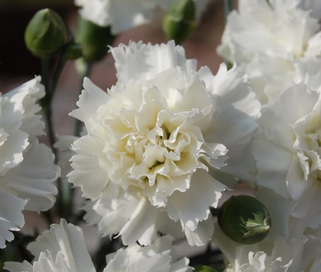 Dianthus ‘Memories’ is a compact, mound-forming, evergreen perennial. It produces pure white, double flowers with serrated edged petals and has a spicy, fruity fragrance.