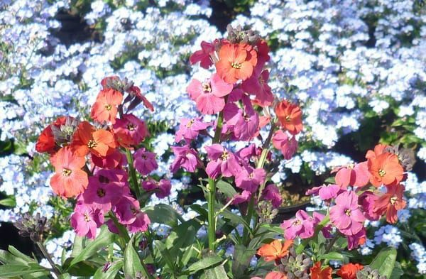Nepeta ‘Six Hills Giant’ and Forget-me-nots make great combination plants with erysimums, because their striking purple and blue hues perfectly complement the vibrant wallflower colours.