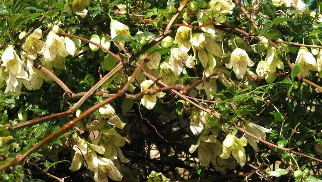 Clematis cirrhosa varieties are evergreen, winter-flowering clematis – very useful for keeping interest in the garden in every season. Plants offer deep green leaves and pale creamy-yellow flowers, often with speckled markings, from late winter into early spring. These blooms nod downwards, a little like hanging bells.