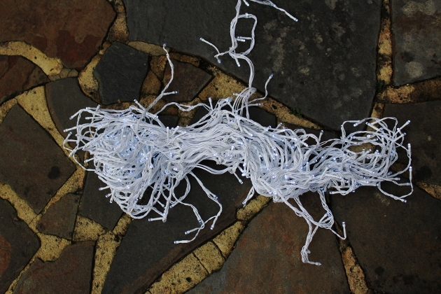 Now, hang your lights. First, plug them in at the power supply – but don’t switch on yet. Then, take the power supply as your starting point and work your way across the hanging area from there. As you place the Christmas light cable into the clips / hooks, you want to make sure the cable is reasonably tight, although not so much so that it pulls at the power supply.