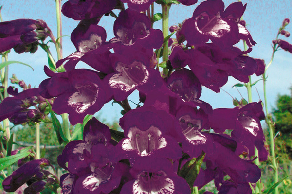 P. ‘Czar is a hardy, clump-forming, upright, semi-evergreen perennial with linear green leaves. The tubular, trumpet-shaped, plum-purple flowers with white interiors are produced from summer into autumn. This is a great plant for attracting and providing nectar for bees.