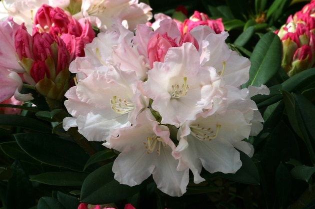 Rhododendrons grow brilliantly with tulips to make a picturesque spring border early in the season when they bloom. Beyond that, consider complementing their foliage with shrubs that can provide colour throughout the year during the rhododendrons non-blooming months. When selecting other plants stay clear of any that are moisture-hungry so the rhododendrons won’t have to compete.