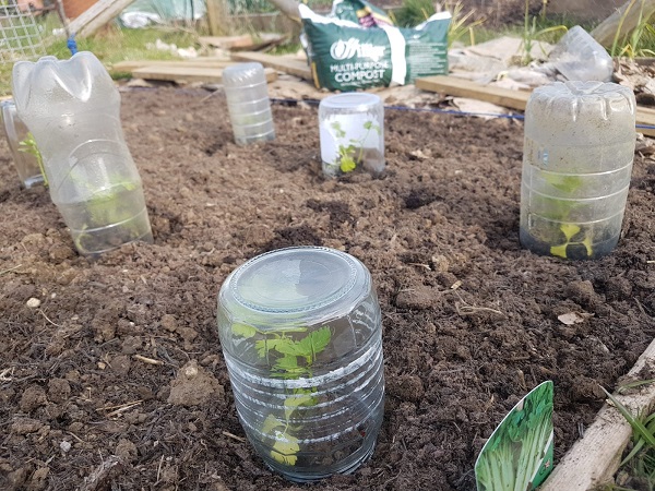 ‘Greenhouses’ for celery plants created by re-using plastic bottles