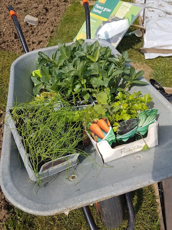 “After a very cold start to the month, a good few evenings of not too cold weather finally emerged in mid April. I headed off to the plot with a wheelbarrow full of goodies – both home-grown from seed and bought as small plants.”