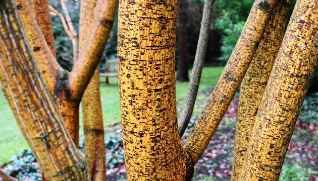 A brilliant year-round tree is the Acer. The foliage may be gone in winter, but many varieties maintain outstanding colours and textures of bark. Acer pensylvanicum ‘Erythrocladum’, for example, is a medium-sized maple with spectacular red-orange bark with white stripes.