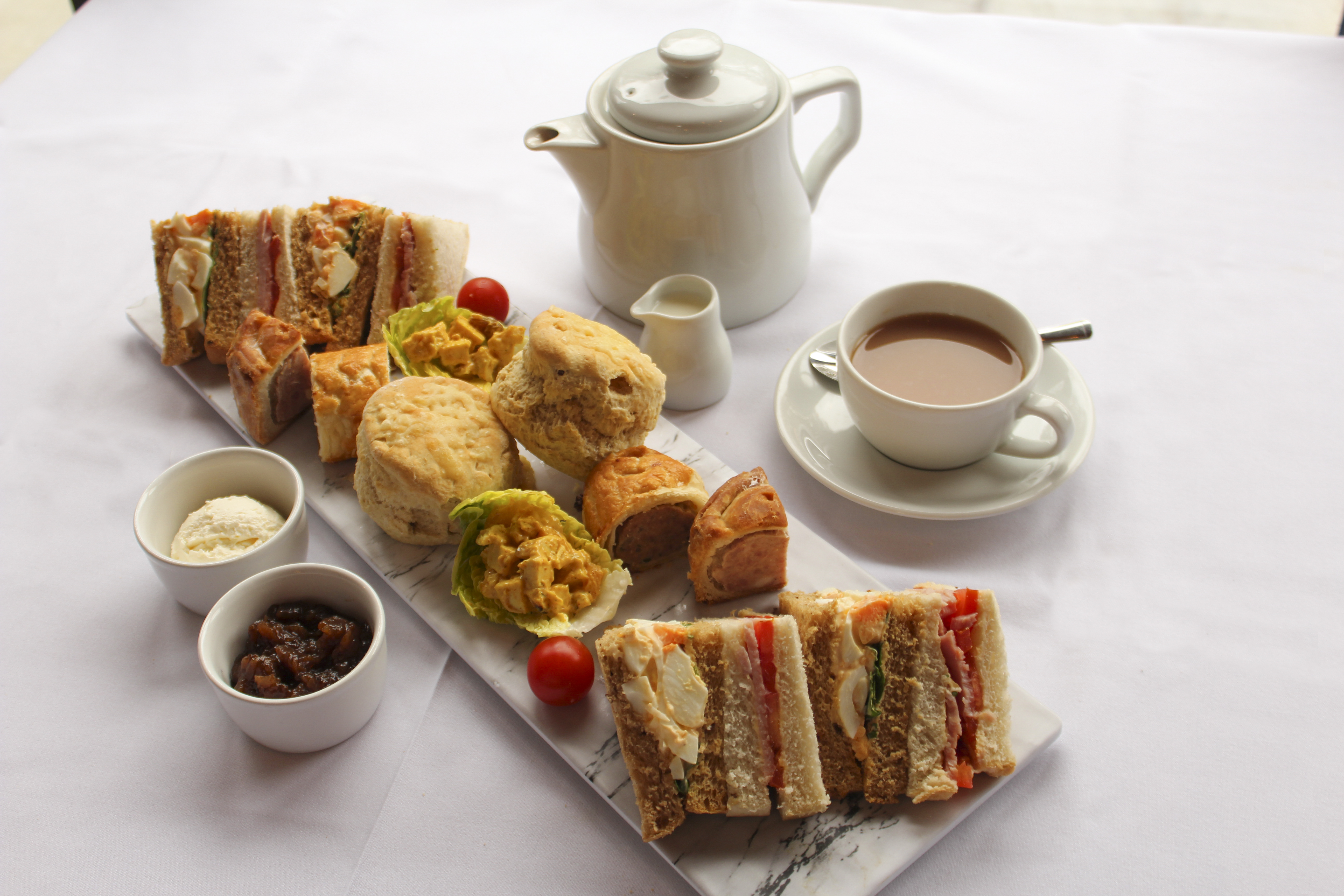Our new savoury afternoon tea includes your choice of freshly made sandwiches, homemade savoury scones with cream cheese and apple & ale chutney, miniature homemade sausage rolls, filled gem leaves, pork pie wedges and limitless freshly brewed tea or filter coffee.