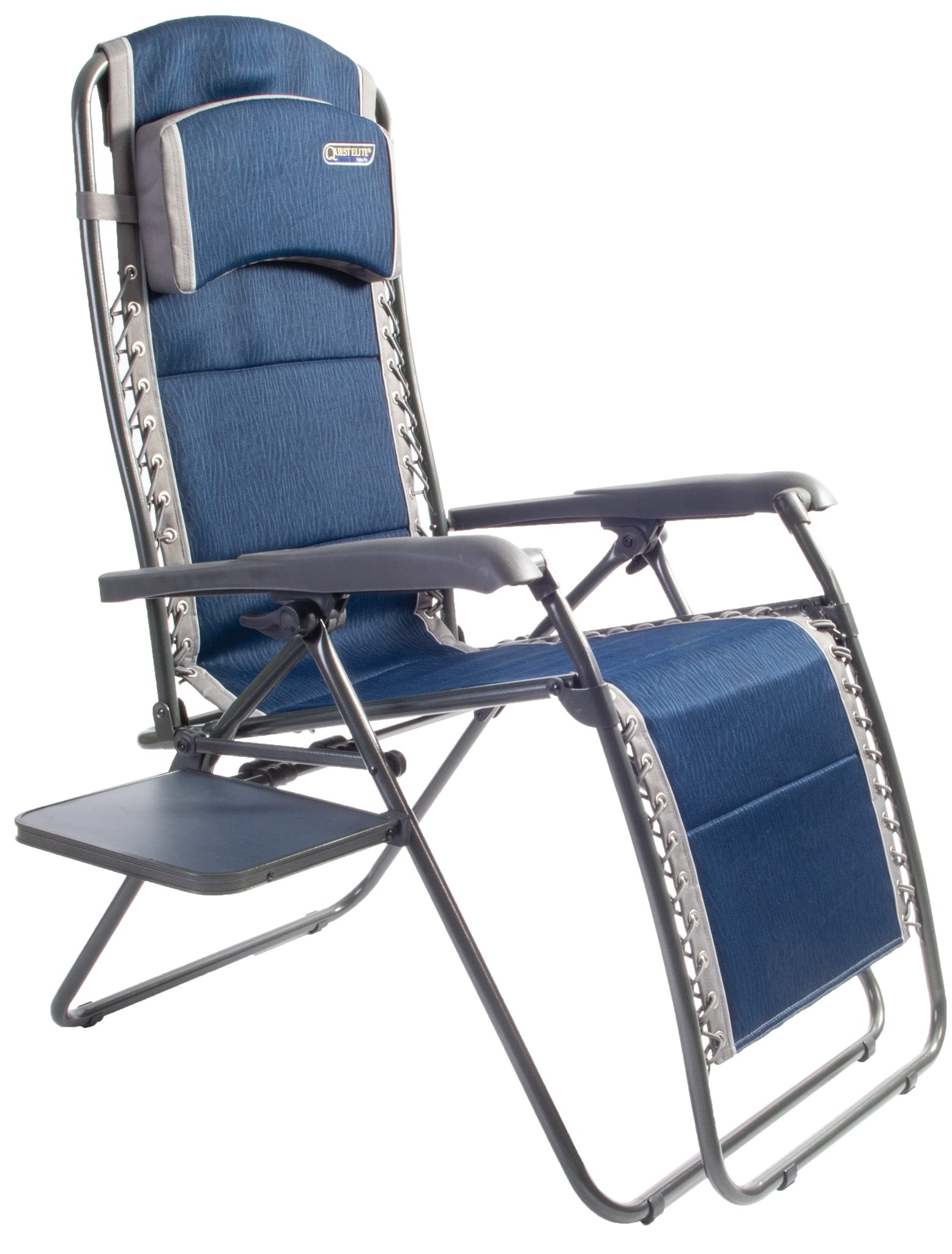Stepless and full recline for maximum adjustability. Exclusive slide out side table. Frame: Premium mottled effect coated steel. Head rest can be used as a lumbar support. Adjustable padded head rest.
